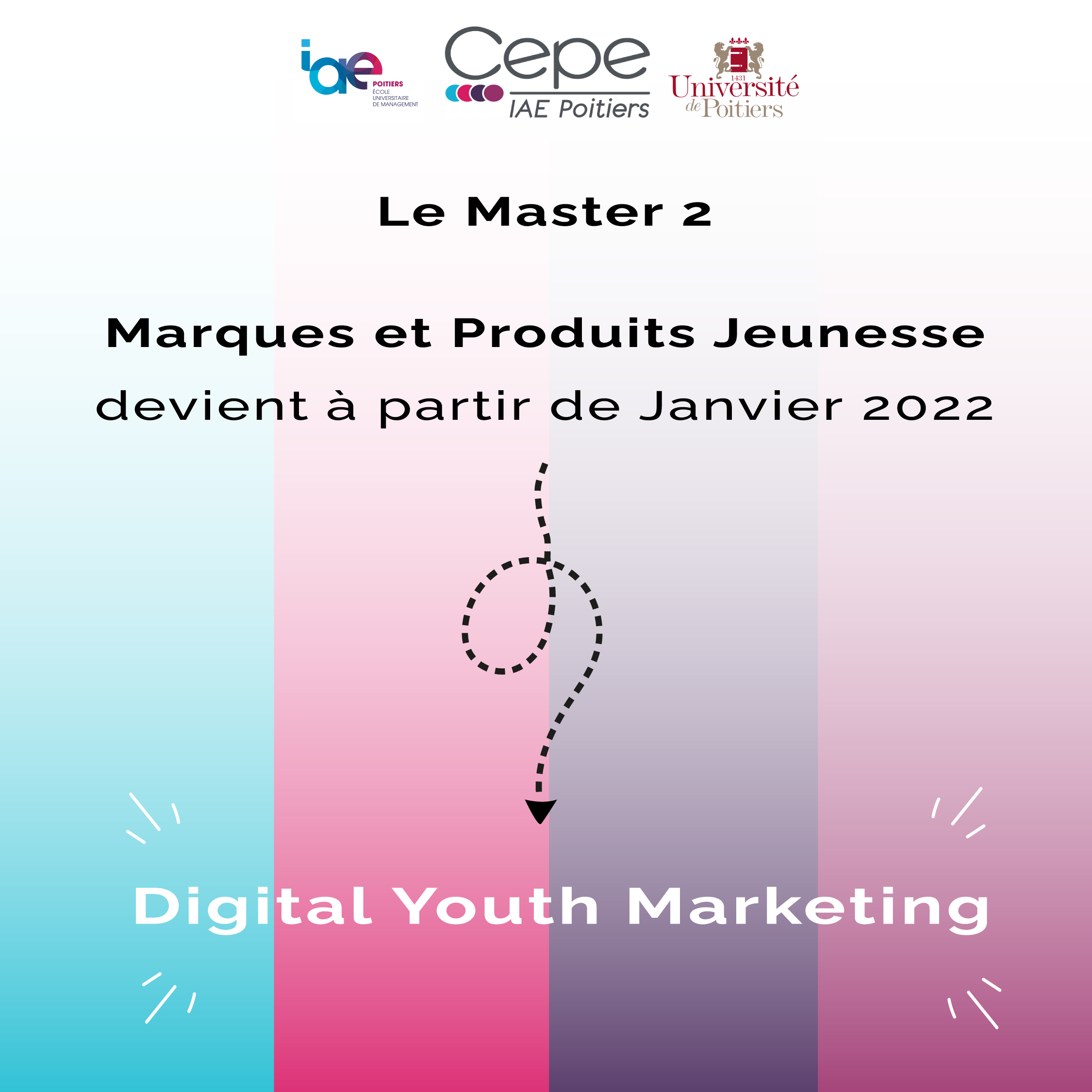 A partir de janvier 2022, le diplôme « Master Marques et Produits Jeunesse » proposé par CEPE-IAE de Poitiers (adhérent Nova CHILD) change de nom et devient « Master Digital Youth Marketing ».